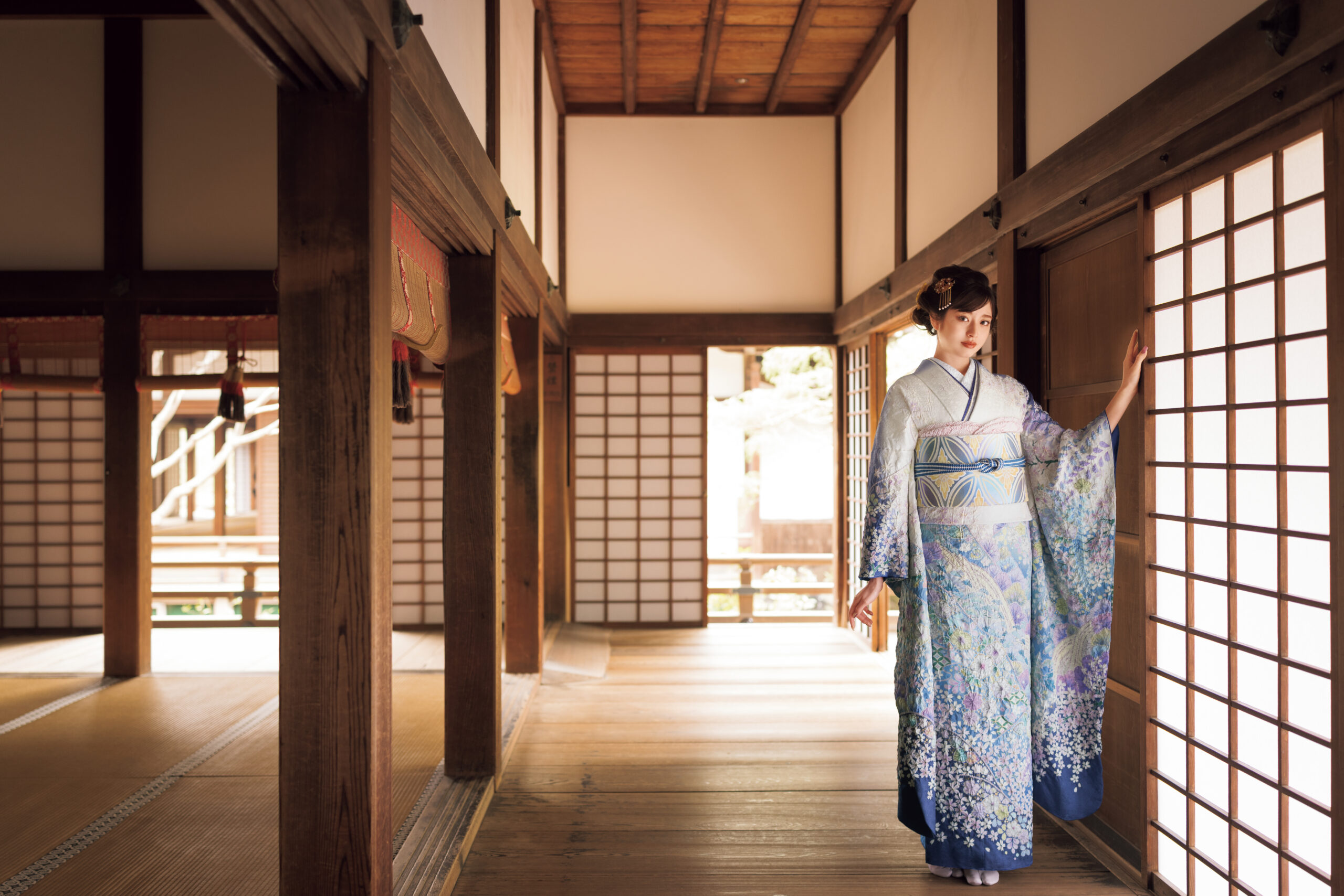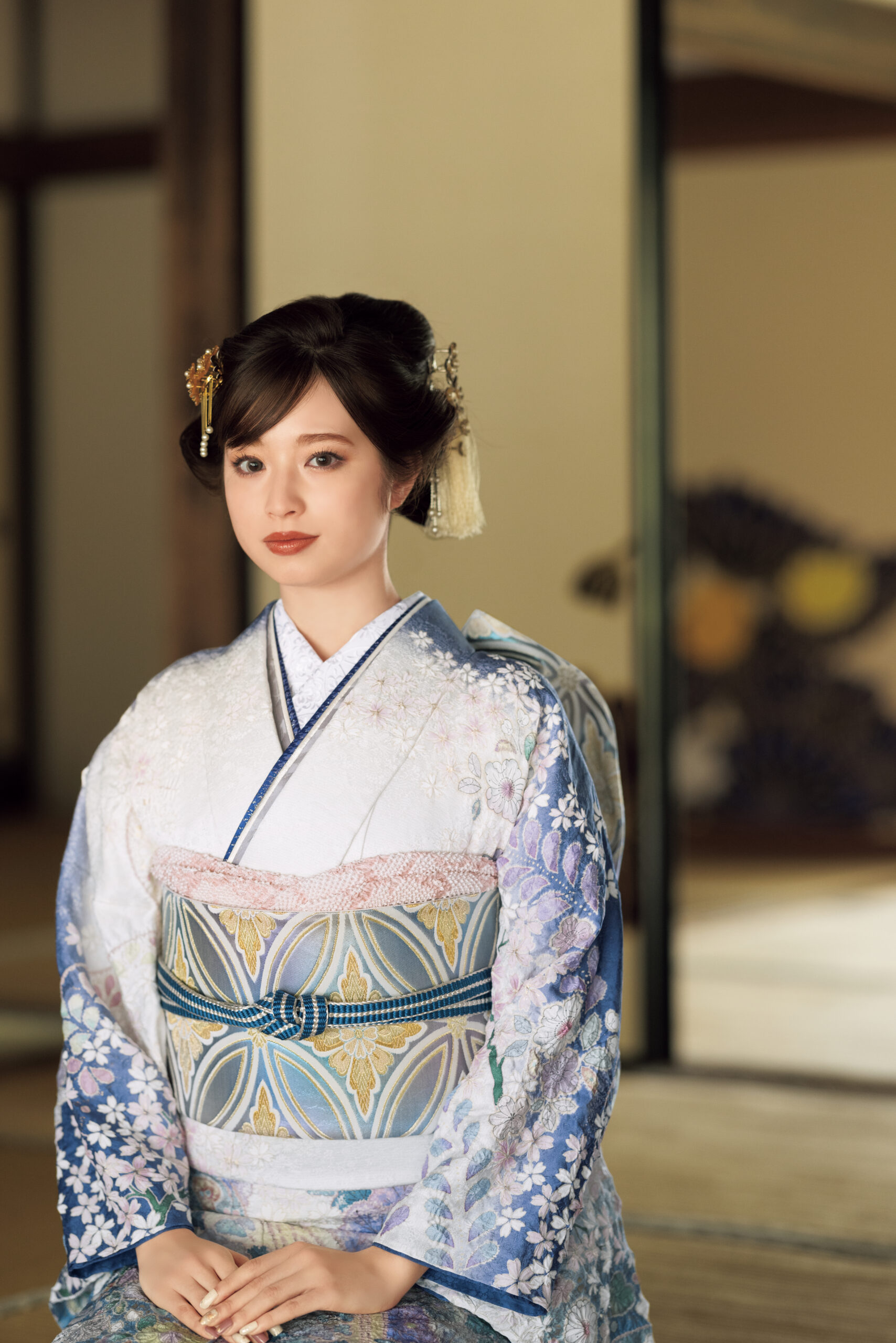 高貴な色彩と絞りの妙で、幻想的な景色が目の前に広がる優雅な辻が花。さらさらと舞うような小付けの桜は新しい季節に寿ぎを告げ、周囲を魅了する振袖美人の誕生です。