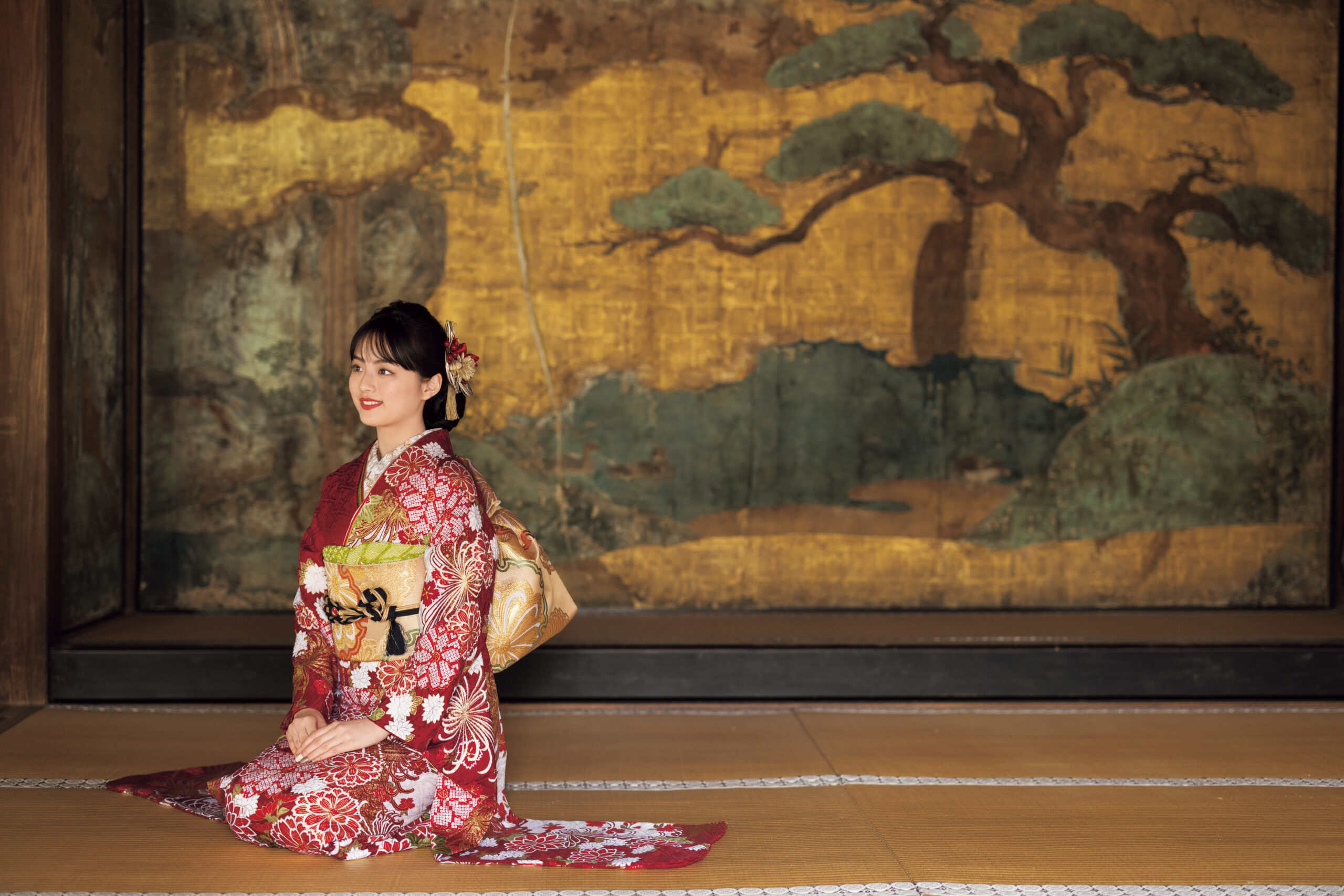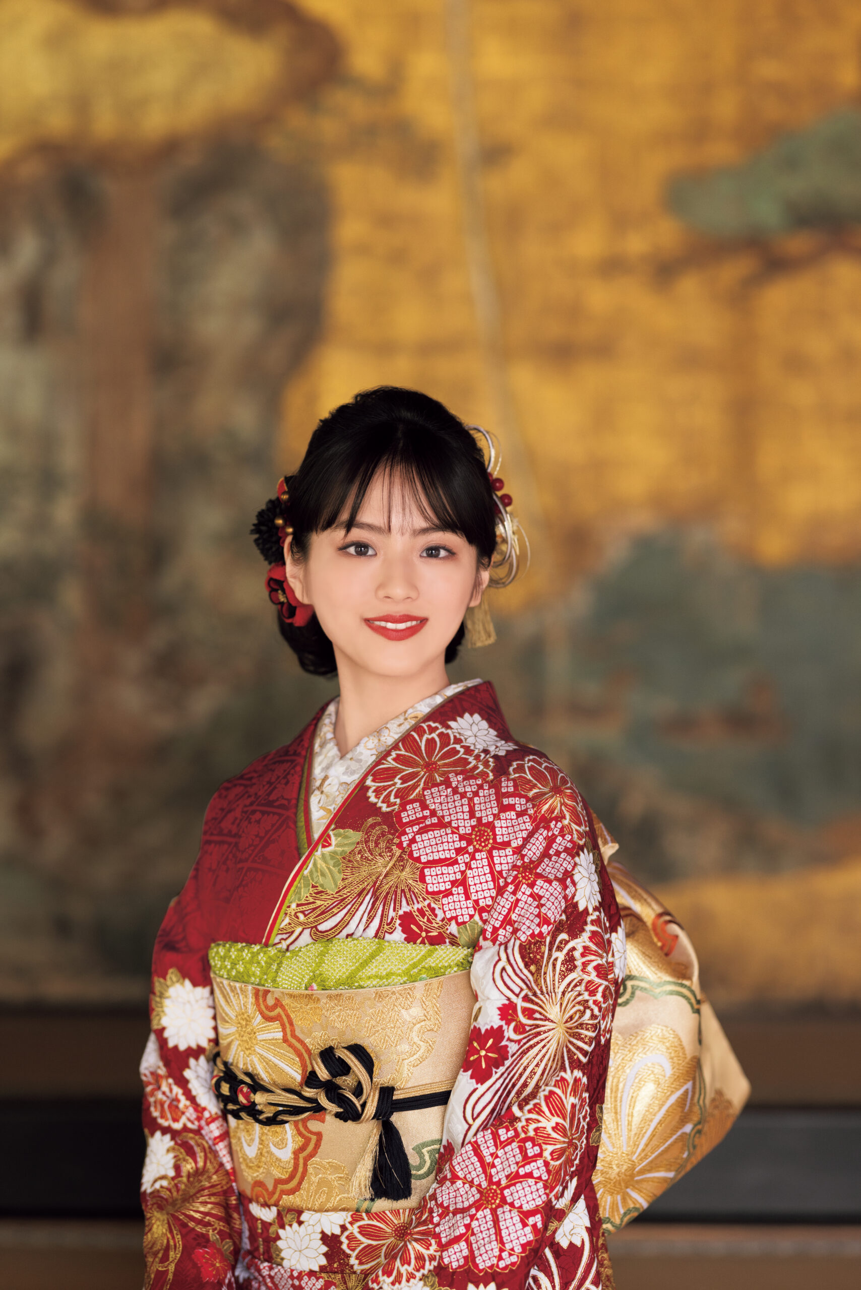 職人の熟練の技を昇華させた金彩が、特別な存在感を放つ振袖。目が覚めるような朱赤に四季の和花を携え、平安のお姫様のごとく輝いて。