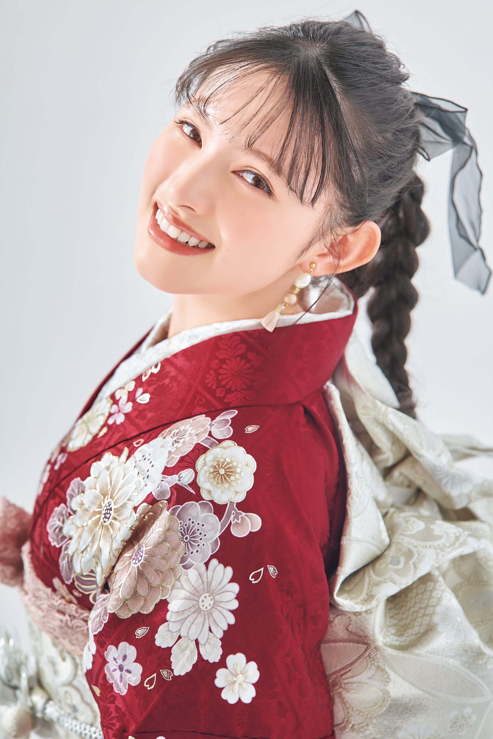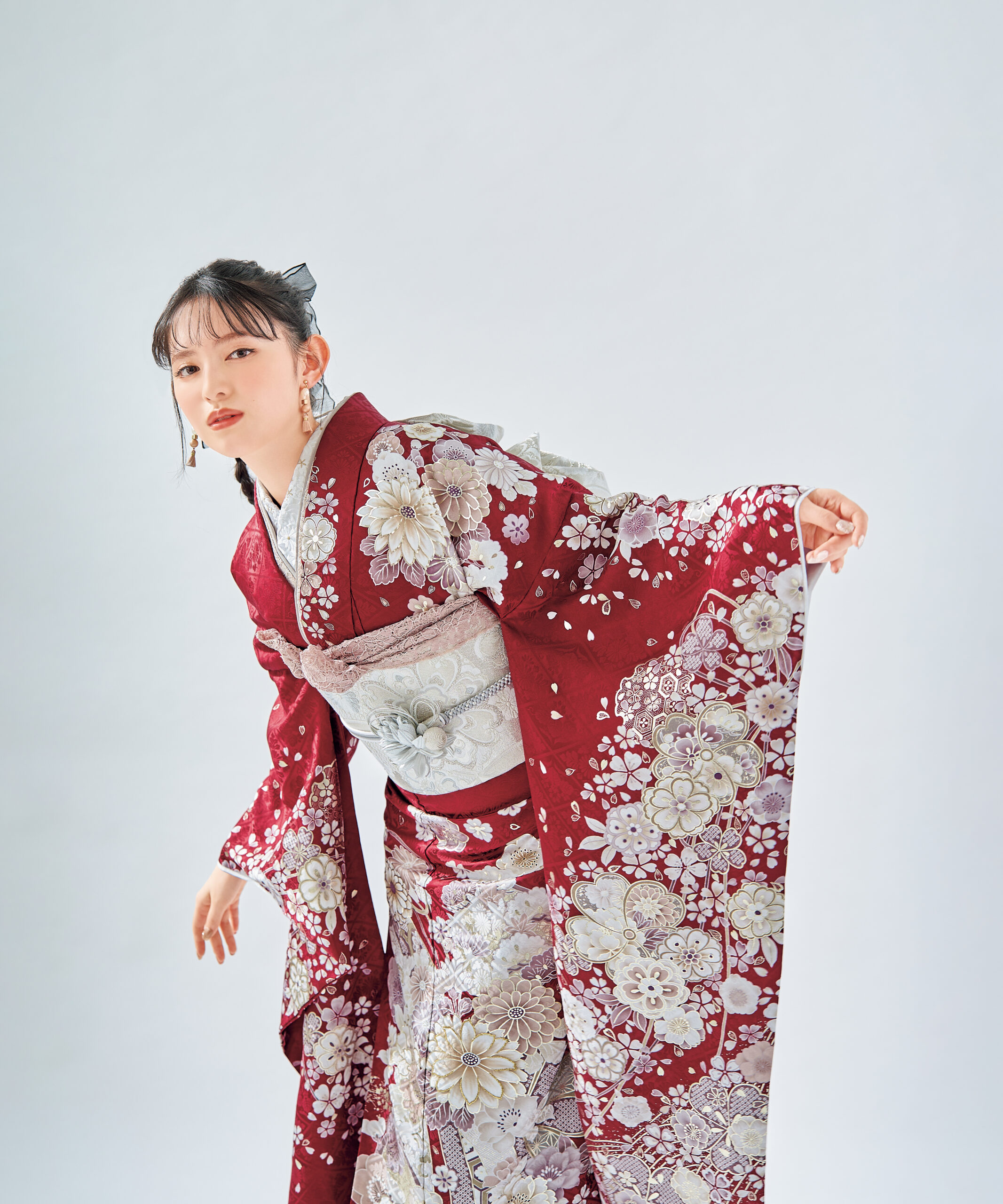 春風に運ばれた可憐な桜吹雪と、星くずのような美しい銀彩。顔映りのよい艶めく臙脂色にゴージャスな束ね熨斗が奥行きを描き出します。