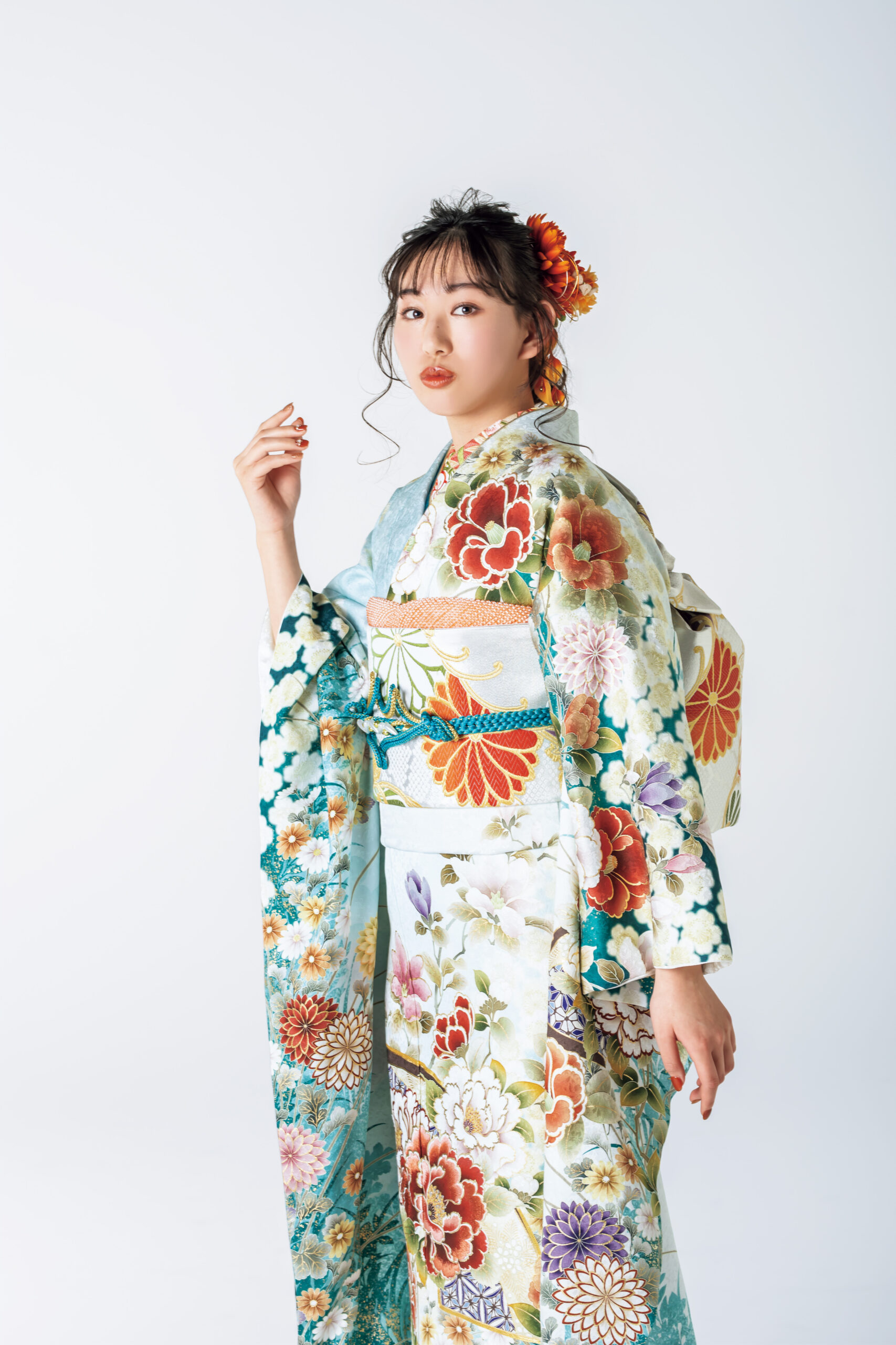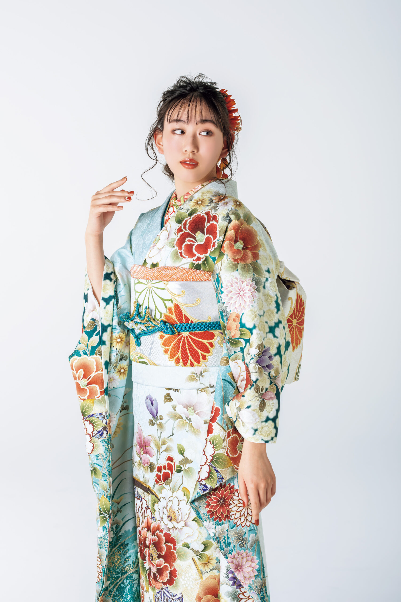 身頃いっぱいに艶やかに描かれた牡丹や椿、菊が存在感を放つ振袖。影絵のようなタッチにアートな趣が感じられ、艶やかな色使いも目を引きます。