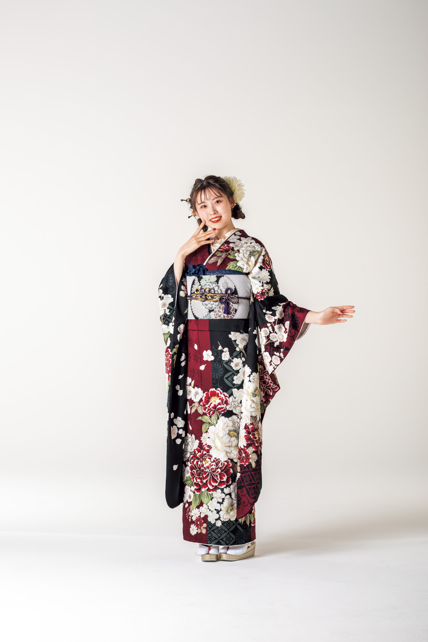 臙脂と黒による縦の染め分けに思わず一目惚れしそう。百花の王・牡丹と可愛らしい桜は共に見頃を迎え、華やかな香りに心が満たされます。